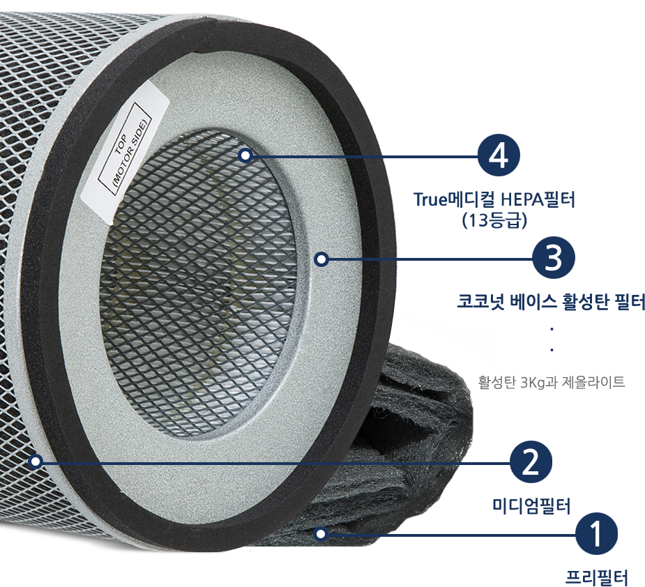 활성탄과 제올라이트로 둘러싸인 True Medicla HEPA필터가 있으며
